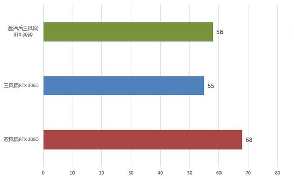 而如果我们将三风扇显卡遮挡一个后,温度大约提升了3℃,再刨去风扇提升的转速,温度大约会提升5℃。